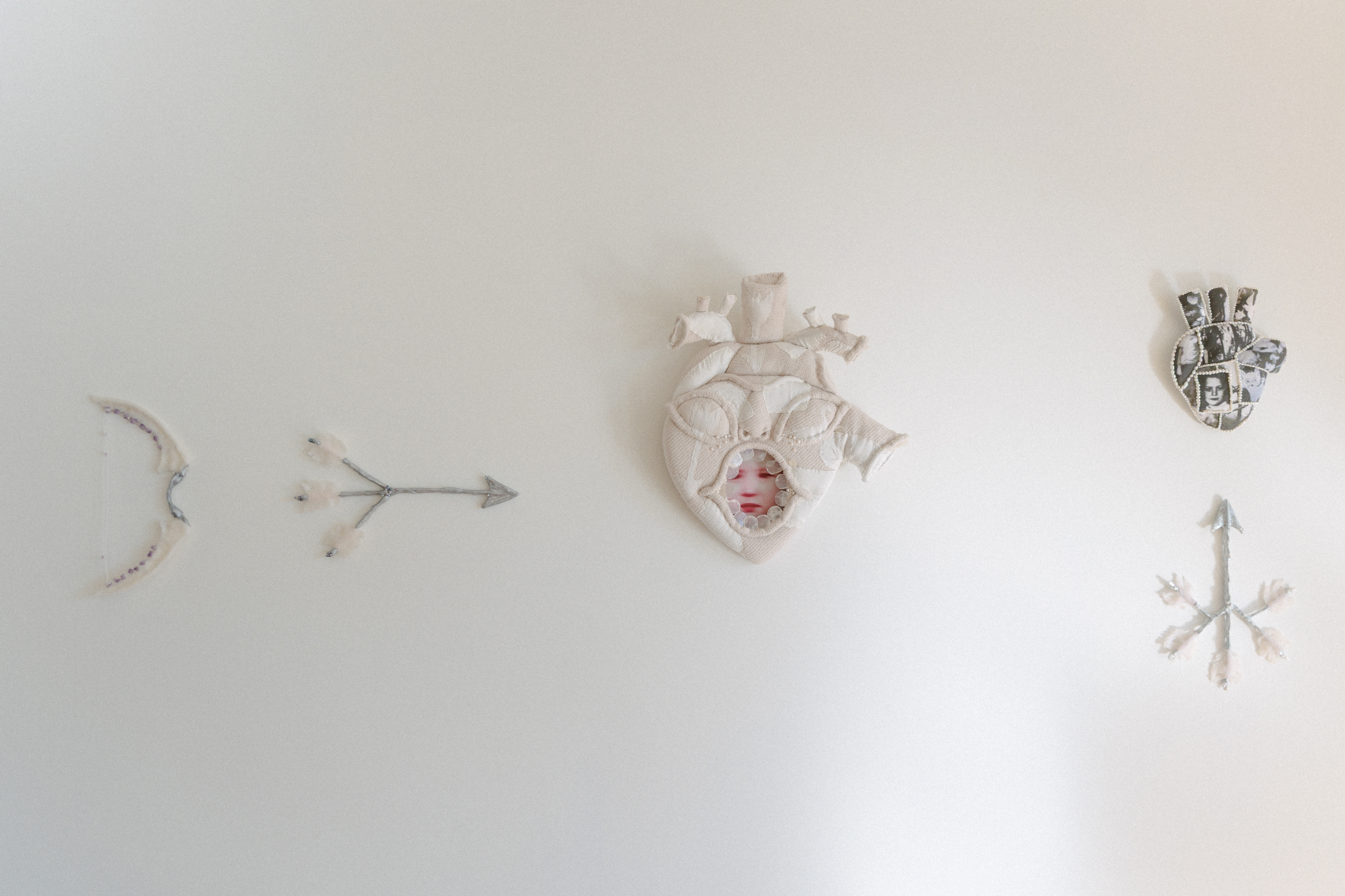 Osipova’s practice speaks in an ancient, matriarchal language that forgoes linear time. Using the Chuvash traditions of embroidery and needlework passed down to her through generations of women, Osipova treats her craft as embodied knowledge. Repeating symbols, such as the bow and arrows, the heart as portraiture, and archival photographs appear throughout as intuitive patterns. Her materials are metaphors: the stories of her family are interwoven as textiles are interwoven, image interlacing with touch, memory with memory. The act of making becomes an act of remembering.