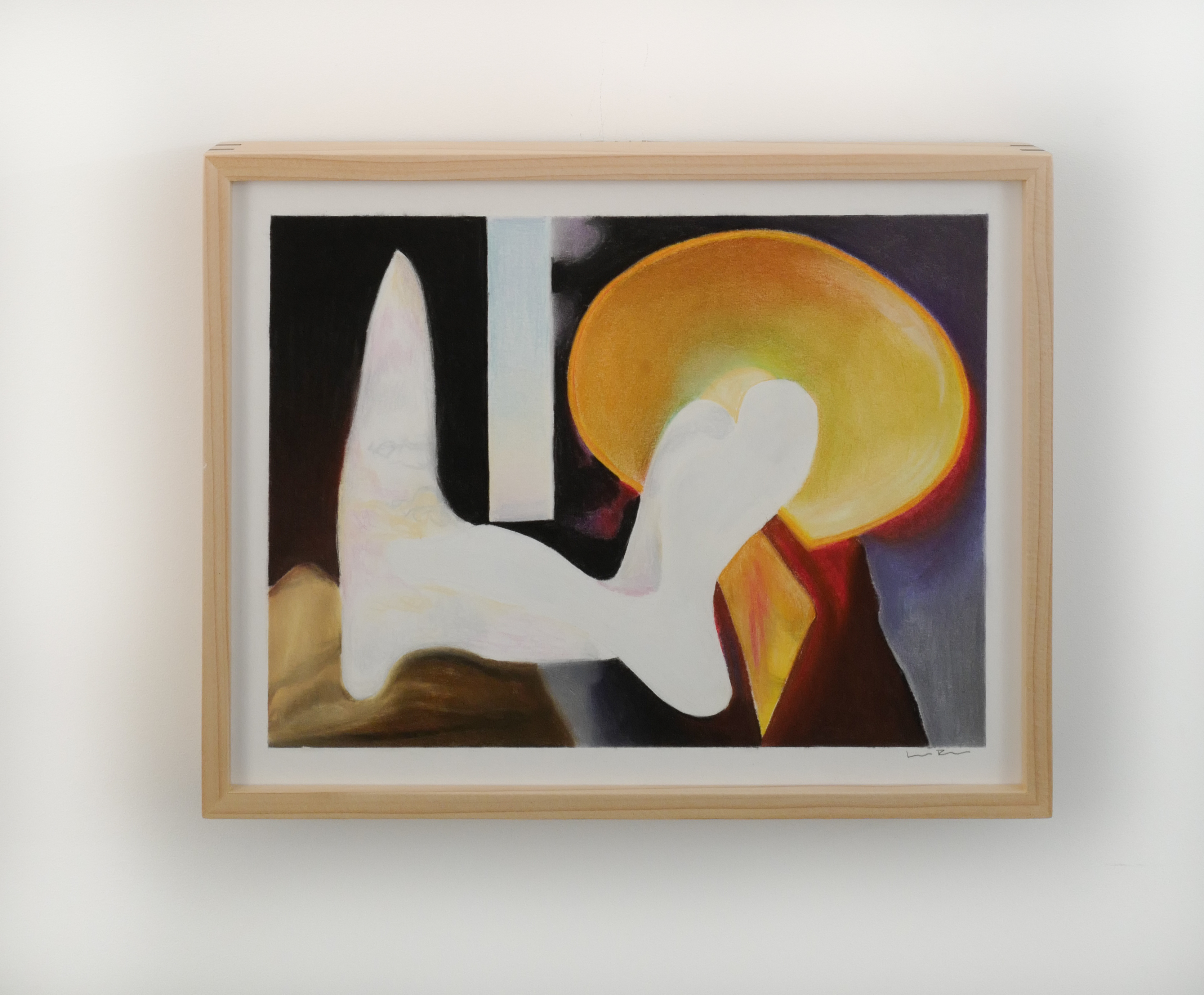 Whoever she or Melissa Ríos is, she exudes femininity through silhouettes of cocoons, shells,and petals that contain and provide a womb for the figurative realism of what we cannot name while encouraging a testimony full of clarity. Alice is now too big for the tea party, her Mary Janes have a thin, sparkly strap, and her white stockings are not the hazy skies of wet lands, but the whirling lava of luminescent lamps. These characters float amongst galactic hues and cotton-candy blues. They are accompanied by yellow disks that spin and flourishing floral motifs that in one instance echo the Pop Art of James Rosenquist and in another, the abstraction of Georgia O’Keeffe, but perhaps more so the uncanny play of René Magritte. Is it the rabbit or the duck; we can never be quite sure.