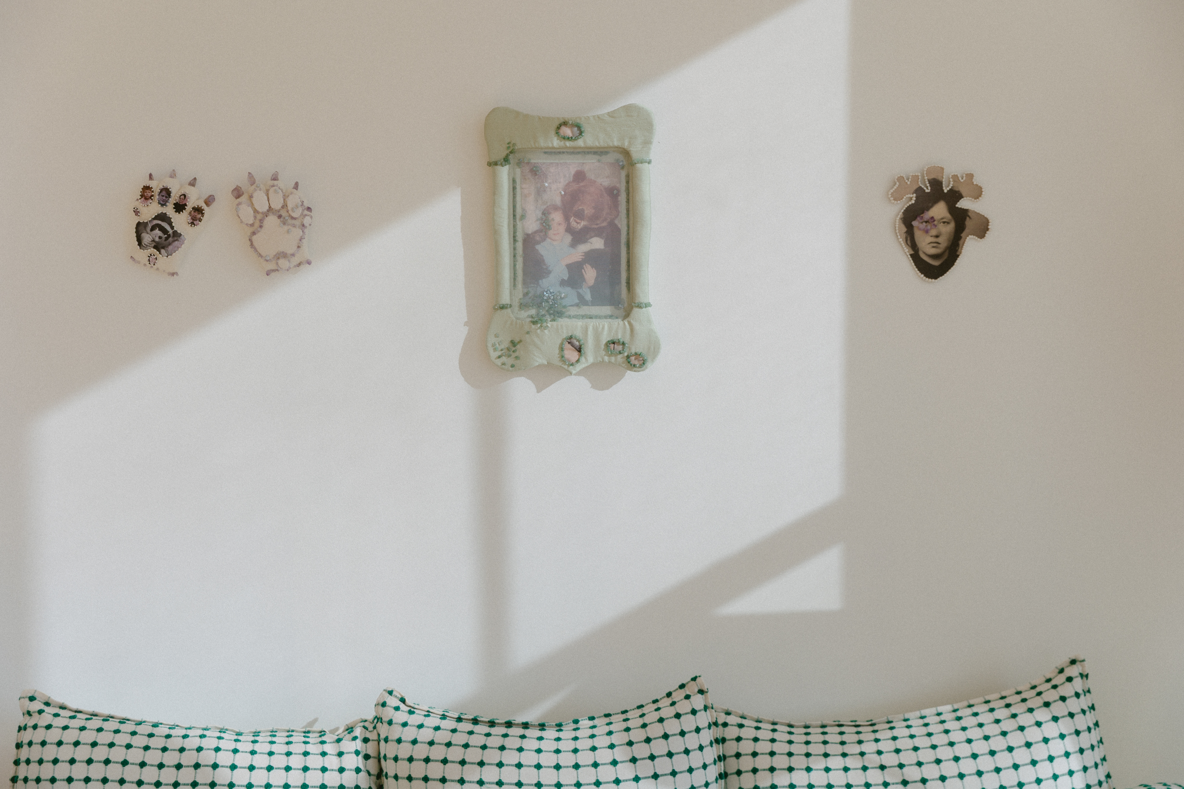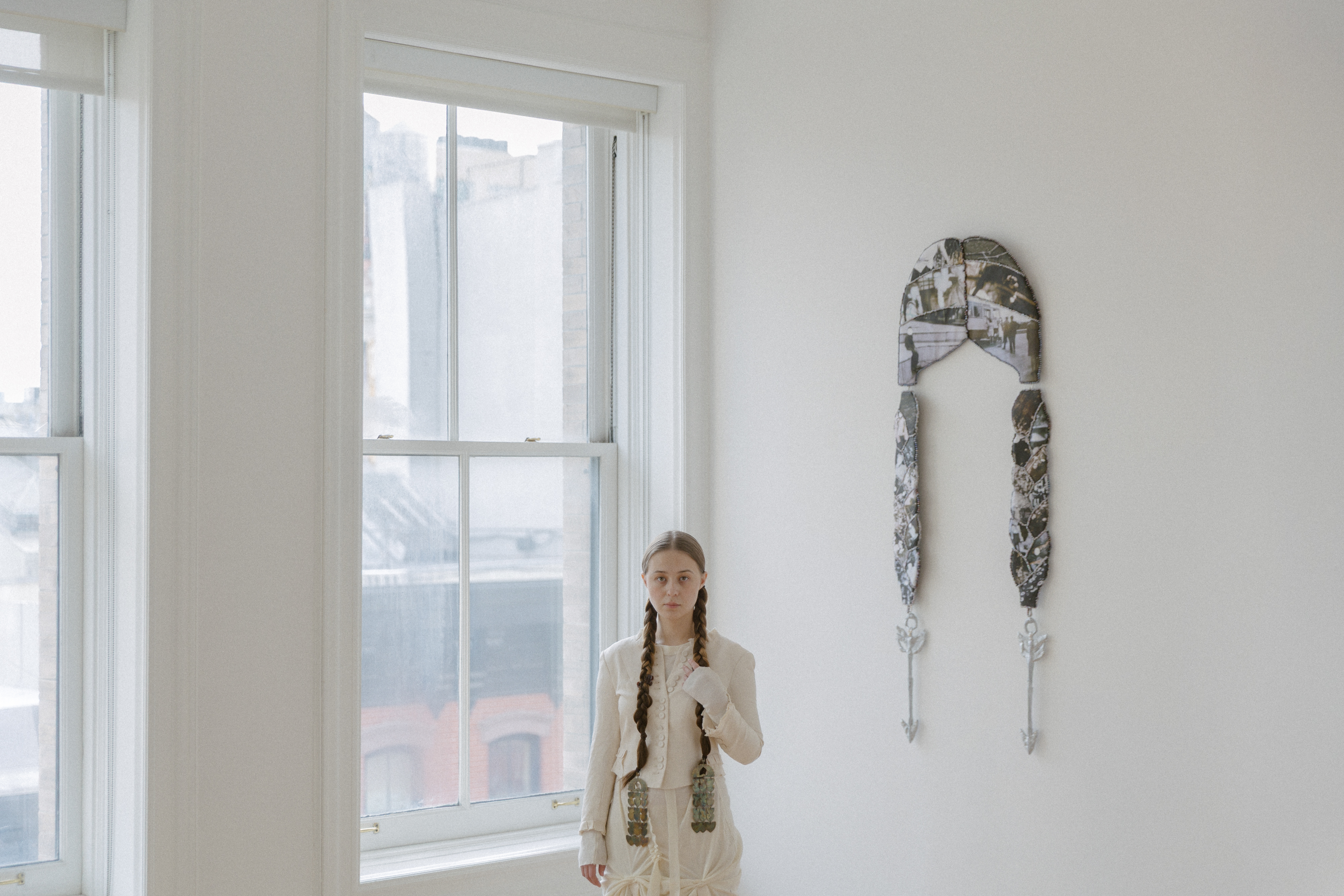 The recurring symbols of photographs in her work creates the illusion of an untold story hidden in her family archives. She mostly creates wearable sculptures, textile sculptures, engages with performance and photography – a set of works she considers intrinsically bound together and functioning as an organic whole. The wearable sculptures and objects she creates function as both regular sculptures as well as garments that are performed in, and which subsequently become a part of a digital mythology, captured in photos and videos.